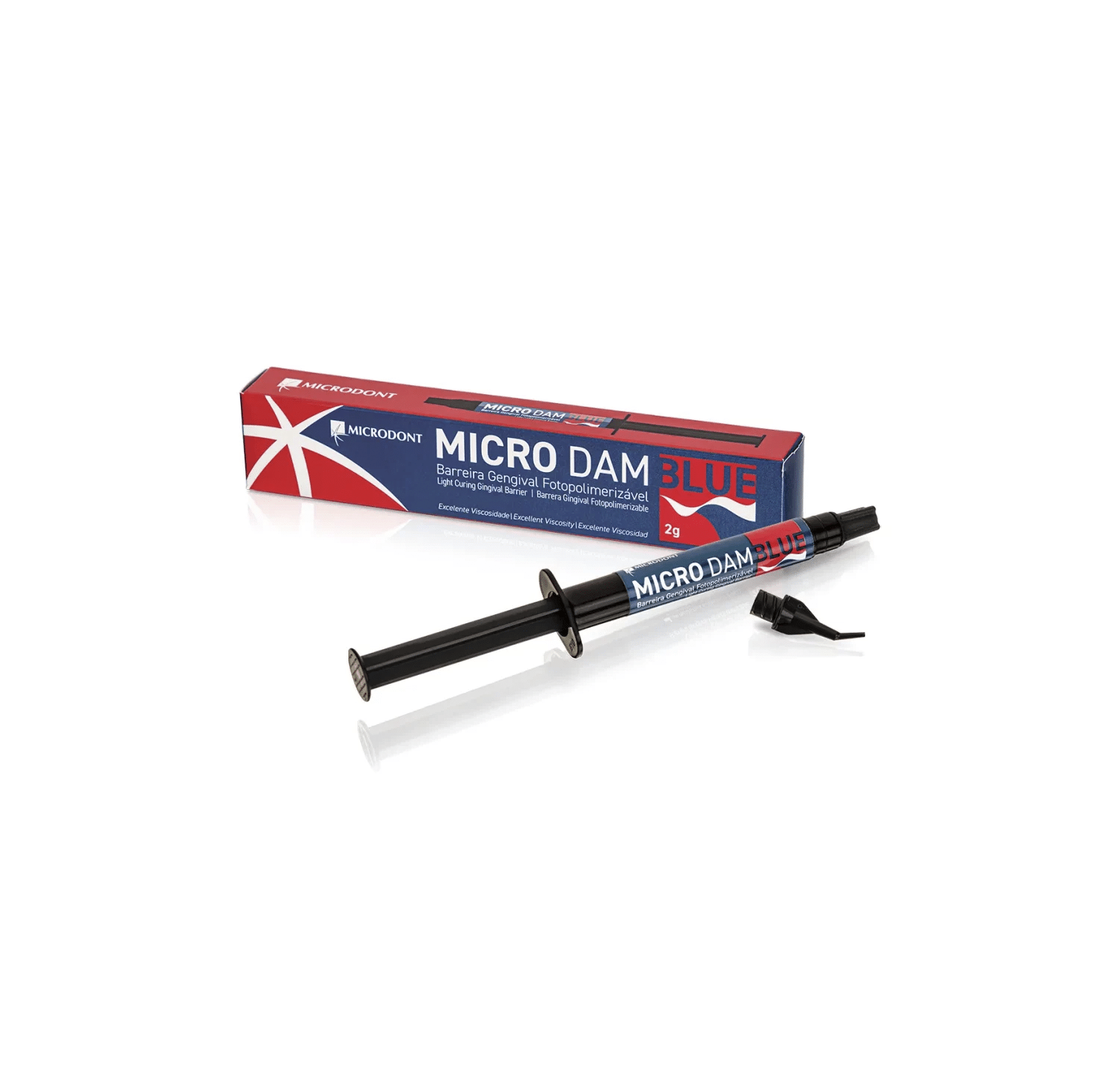 - Micro Dam Blue es una barrera gingival fotopolimerizable de color azul indicada para la protección del tejido gingival, evitando que el gel blanqueador entre en contacto con estos tejidos. También puede actuar como complemento del aislamiento absoluto para un mejor sellado durante el tratamiento dental.