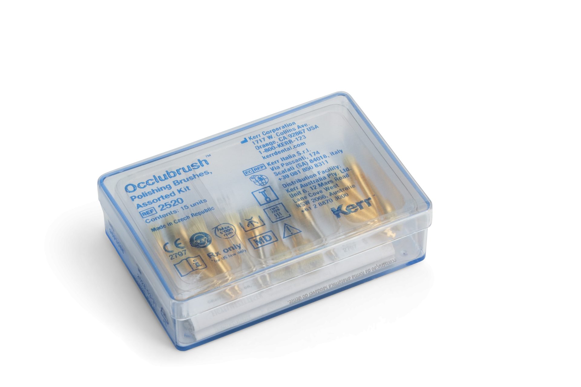 - Occlubrush es un sistema de pulido de un paso para composites, compómeros, ionómeros de vidrio modificados con resina y restauraciones indirectas de cerámica. La fibra especial de las cerdas garantiza que OccluBrush no daña la estructura dental ni los márgenes de la restauración. No es necesaria ninguna pasta y se trabaja más rápido y eficiente que otros sistemas de pulido con pasta.